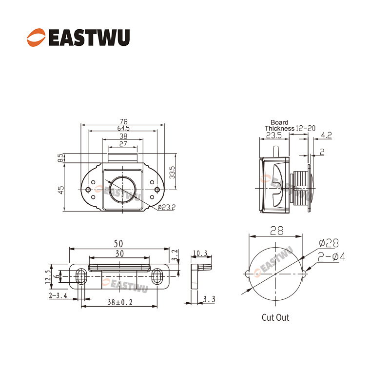 ·Material: Zinc Alloy push button, decoration ring, cam & connecting bar; Plastic lock base.