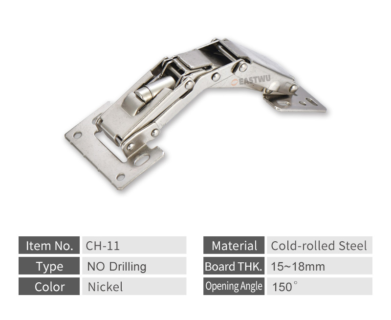• Nickel RV Cupboard Door Hinge Cold-rolled Steel NO Drilling Opening Angle 150°